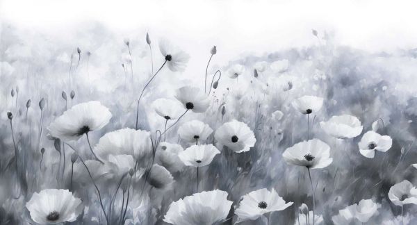 This dreamy scene captures the refinement of white poppies that seem to float against a bright, pastel blue sky. The brushstrokes are soft and flowing, creating a sense of freshness and tranquility. The delicate transition between the white petals and the calm blue tones adds depth and serenity to the design. The pattern is ideal for interiors that need a light and uplifting accent. Think of modern, minimalist spaces where the pastel blue background provides a refreshing contrast. In a coastal or beachy style, this design can contribute to the maritime atmosphere, especially when combined with light woods, white furniture, and subtle sea tones. This floral print fits well in bedrooms, bathrooms, or studies, where the soft blue hue gives a sense of space and calm. With accessories in silver or soft gray, you can emphasize the cool charm of this design, while additions in beige or cream enhance the warmth of the white poppies.