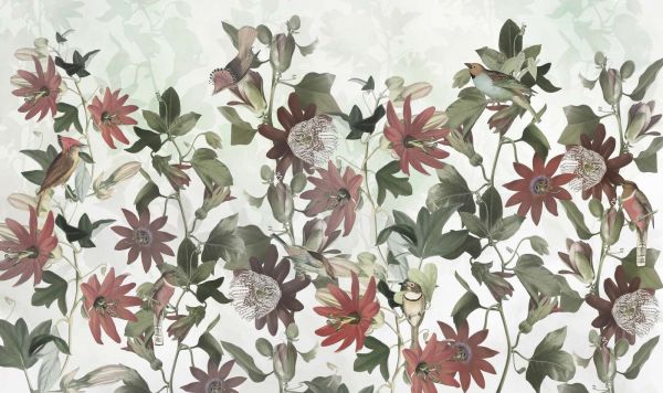 An enchanting design in which vibrant birds mingle among exuberant passion flowers and lush greenery. Every detail, from the delicate feathers to the graceful blossoms, brings a playful yet refined energy to the design. The soft color shades create a harmonious background that looks both natural and elegant.