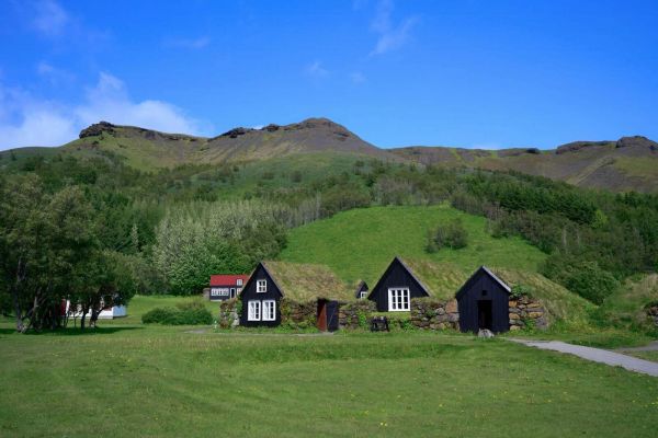 Black houses with white frames and overgrown grass roofs lie peacefully in a green valley, surrounded by rolling hills, forests, and a clear blue sky. The rustic atmosphere exudes simplicity and a connection with nature.