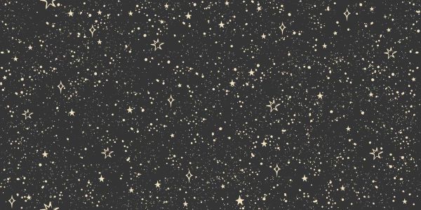 A lively star pattern with glittering shapes, splashes and speckles in soft cream on a deep black background. The design radiates magic, lightness and a touch of fantasy.