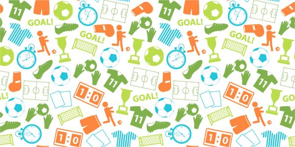 Wallpaper with colorful sports related illustrations, such as sportswear, a sports field, a boxing glove, a goal, and a stopwatch.