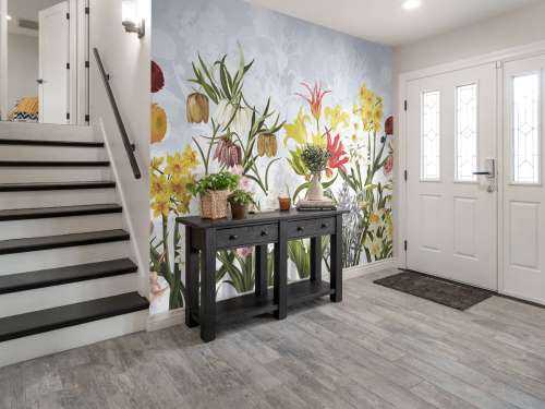 This design combines the beauty of natural elements with the finesse of artistic details. Beautiful flowers in a diverse palette of colors, combined with elegant leaves, bring a vibrant and harmonious atmosphere to any space. The background color varies subtly, enhancing the versatility of the design. Ideal for both modern and classic interiors, it pairs excellently with natural materials such as wood, linen, or soft-colored furniture. This design fits perfectly in living rooms, bedrooms, or dining rooms that need a refined appearance. The flowers provide a fresh and inviting character, while the colors subtly enhance the space. Suitable for any season, this design brings timeless elegance to your interior.