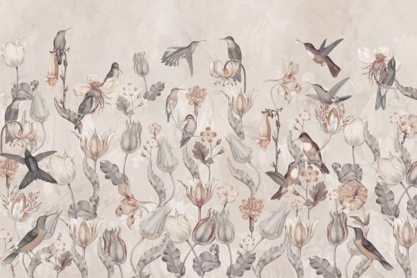 This refined design combines the graceful shapes of blooming tulips with the elegant movement of hummingbirds. The pastel colors and detailed accents create a harmonious whole that radiates both freshness and sophistication. Each element, from the petals to the delicate wings of the hummingbirds, is carefully illustrated to evoke a sense of natural elegance. The pattern fits beautifully in a romantic interior, where it can fill the space with a soft, spring-like atmosphere. In a more modern decor, it adds a touch of organic beauty while providing a subtle contrast to clean lines and minimalist furniture. Combine it with light wooden furniture, neutral fabrics, or colorful accents like pink or green cushions to complete the look. This versatile design is ideal for use in living rooms, bedrooms, or even conservatories, where it brings a natural serenity and warmth. The combination of soft colors and botanical elements makes it a timeless choice that can create a soothing and inviting atmosphere in any season.