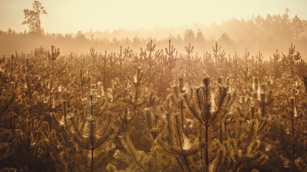 Sunrise over a young pine forest. The photo was taken during a beautiful autumn morning. You can see how the rising sun adds life and wakes up nature after a cold night.