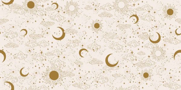 This design captures the beauty of a dreamy sky full of symbolism and gentle movement. Golden suns radiate warmly from the surface, with playful variations in style and detailing. Crescent moons float gracefully among them, surrounded by showers of stars and sparkling dots. Swirling clouds, drawn in fine curls and lines, create an airy rhythm throughout. The warm, soft cream background makes the design friendly, approachable and highly versatile. Within a classic or vintage interior this design pairs perfectly with a love of detail, history and characterful elements. At the same time it feels modern and light enough to also find a place in a Scandinavian interior, where it adds that touch of mystique and warmth to a calm base. For styling, this design works beautifully with light woods, linen curtains or furniture in cream, beige or taupe. Gold accents in lighting, frames or decorative objects strengthen the connection to the pattern. For a more pronounced effect, colors like rust red, olive green or terracotta can be added; they contrast nicely without overpowering the design. Gold suns, moons and clouds are an excellent fit for a bedroom, meditation room, nursery or even a calm entryway. It radiates softness, mystique and timelessness — as if you’re looking at a quiet, astrological artwork that continues to captivate.