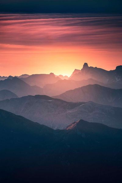 This design shows an impressive sunrise above a layered mountain landscape. The silhouettes of numerous mountain slopes stretch out to the horizon, with each layer subtly shifting in color from cool blues and grays to warm purples and soft golds. The first rays of light are just breaking through, illuminating the highest peaks, creating an almost ethereal contrast between darkness and daylight. The atmosphere is quiet and meditative — ideal for a space where peace, reflection, and natural beauty are desired. This design seamlessly fits a minimalist modern or Japandi interior. In a minimalist setting, it makes a powerful yet subtle statement, while in a Japandi environment, it brings harmony with natural materials, calm colors, and simple shapes. Combine with light wood, matte black, beige textures, and soft lighting for a balanced overall look. The color gradient in this design — from deep midnight blue through lavender purples to warm oranges and golds — creates depth and tranquility. The horizontal layers of the mountains provide a natural rhythm in the composition and give a sense of endless space. The soft twilight makes the whole piece light, poetic, and timeless. Perfect for a bedroom, meditation space, dining room, or quiet study. This design invites slowing down, breathing, and becoming still — as if standing on a high mountain, looking at the first promise of a new day.