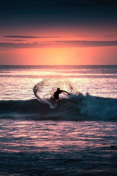A silhouette of a surfer stylishly riding a wave at sunset. The sky and sea are enveloped in deep pink, purple, and orange hues, while the splashing water glows in the soft evening light.