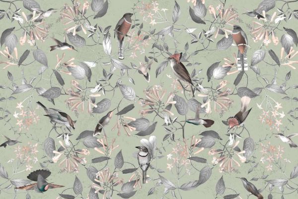 Tescoma bird paradise brings a serene and vibrant atmosphere to any space. The design showcases a dynamic interplay of detailed birds, floating and resting among a lush pattern of climbing plants and refined flowers. The complex textures and rich hues range from soft pastel colors to bold accents, making the design perfectly suited for both modern and classic interiors. For a romantic look, combine this design with vintage furniture pieces in neutral tones and accents of brass or copper. In a contemporary space, the design can beautifully complement minimalist furniture and a few playful color accents. Think of a stylish lounge corner or a quiet workspace; the design fits anywhere nature and elegance are desired. The color nuances in the flowers and leaves create a visually interesting layering, while the birds add liveliness. This versatile design can be used to bring walls to life in living rooms, bedrooms, or even commercial spaces like boutiques and café interiors.