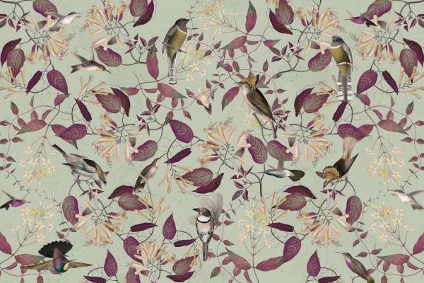 Tescoma bird paradise brings a serene and vibrant atmosphere to any space. The design showcases a dynamic interplay of detailed birds, floating and resting among a lush pattern of climbing plants and refined flowers. The complex textures and rich hues range from soft pastel colors to bold accents, making the design perfectly suited for both modern and classic interiors. For a romantic look, combine this design with vintage furniture pieces in neutral tones and accents of brass or copper. In a contemporary space, the design can beautifully complement minimalist furniture and a few playful color accents. Think of a stylish lounge corner or a quiet workspace; the design fits anywhere nature and elegance are desired. The color nuances in the flowers and leaves create a visually interesting layering, while the birds add liveliness. This versatile design can be used to bring walls to life in living rooms, bedrooms, or even commercial spaces like boutiques and café interiors.