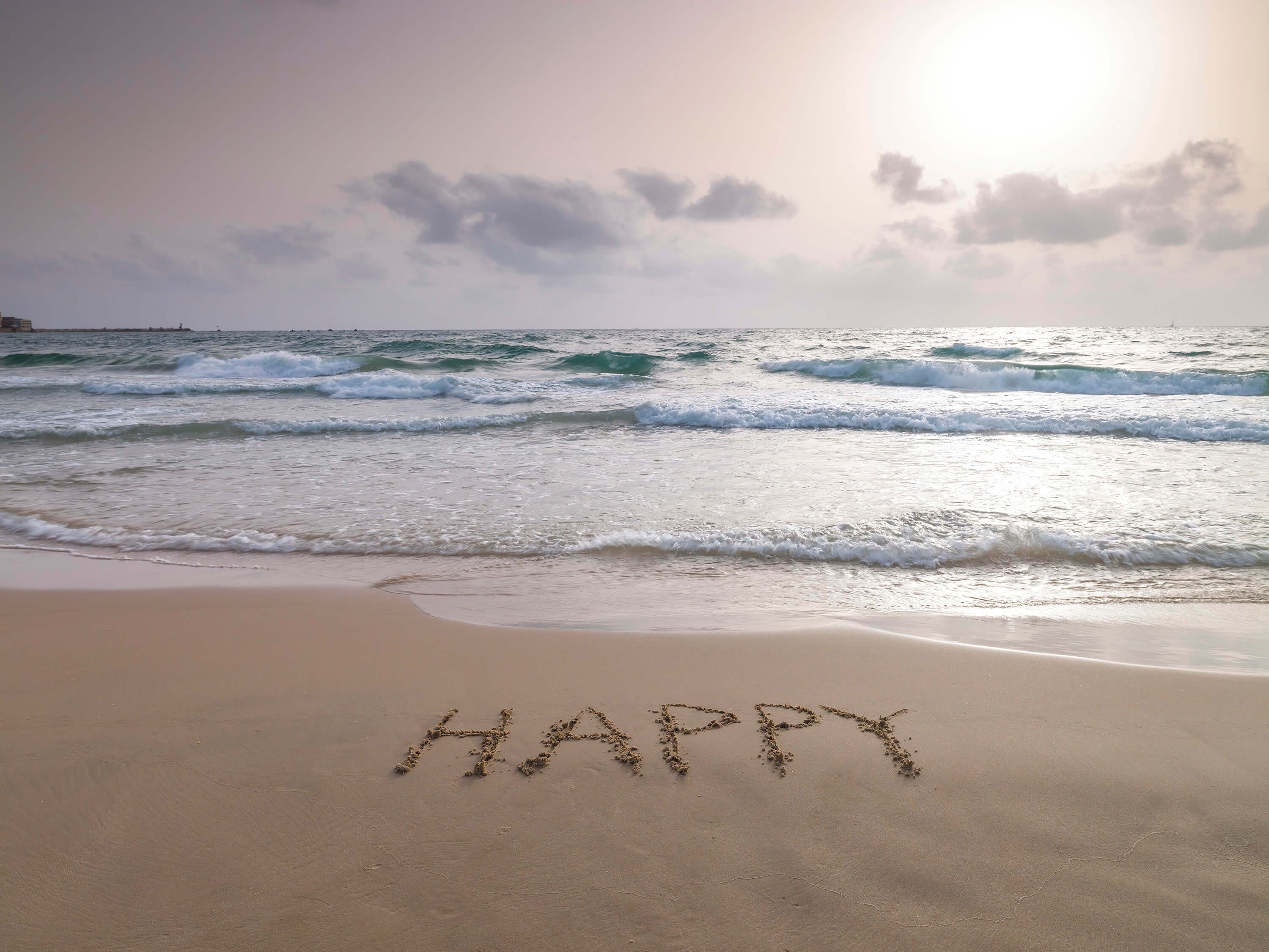 Text in the sand on a quiet beach. In the sand is written ''Happy''.