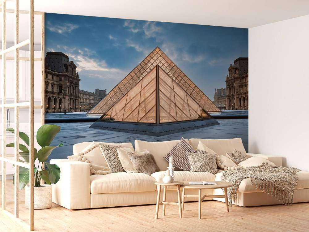 Photo wallpaper of a triangle-shaped design that gives off light. Combine this in the home for more atmosphere.