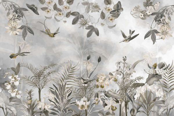 This design captures the essence of a tropical paradise, where natural beauty and serenity come together. Exotic flowers such as orchids and passion fruits bloom amid lush palm trees and various green leaves. Hummingbirds float gracefully through the air, surrounded by subtle butterflies that dance delicately among the flowers. The color scheme, consisting of soft pastel shades and lively accents, emphasizes both a fresh and relaxed atmosphere.