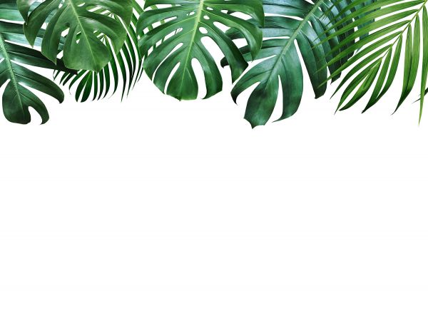 Various tropical plants on a white background. The plants hang from the top to the bottom.