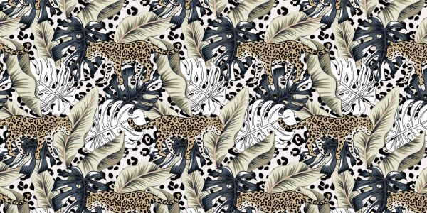 Leopard surrounded by banana and palm leaves with a leopard pattern in the background.