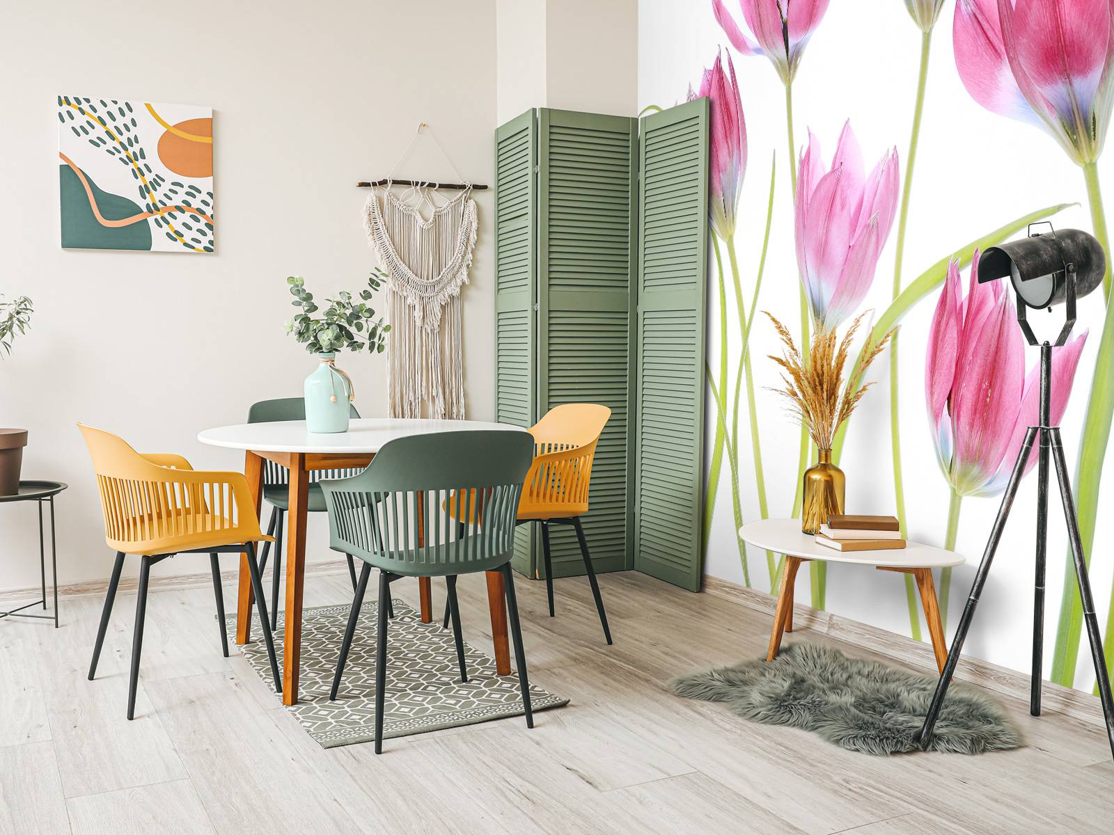 Tulip blush are beautiful pink tulips on a white background. This photo wallpaper creates a peaceful and unique atmosphere in your home.