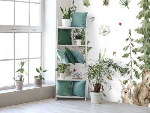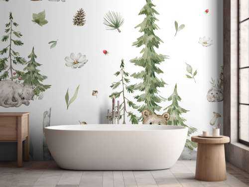 Resting bears, a vigilant badger, and an owl perched on a branch form a serene forest company. Surrounded by pines and accented with woodland flora, this composition creates a sense of peace and relaxation in the natural world.