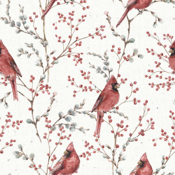 This atmospheric design captures the charm of a peaceful winter morning, with bright red cardinals nestled on branches full of berries. The illustrations are executed in a delicate watercolor technique that provides a refined, almost hand-painted appearance. The red birds create a beautiful contrast with the soft gray-green and blue-gray tones of the foliage, while the subtle background texture adds depth to the whole without being overpowering. In a classic interior, this design forms a warm accent, especially in combination with wooden furniture, velvety fabrics, and deep colors like burgundy or moss green. This motif also fits perfectly in a cottage or country style: think white wood, knitted throws, soft wool, and natural materials. It adds a cozy, nostalgic atmosphere to any space. The color scheme is soft and balanced: bright red for the birds, combined with branches in beige and brown tones, berries in warm red, and gray-green leaves. These colors create a calm, wintry atmosphere without becoming gloomy. This design comes beautifully into its own in a living room, hallway, or reading nook where warmth and ambiance are desired. Also very suitable for a seasonal accent in a bedroom or conservatory, especially during the winter months. The subtle repetition of the pattern provides tranquility, while the cardinals add a sparkling and lively element.