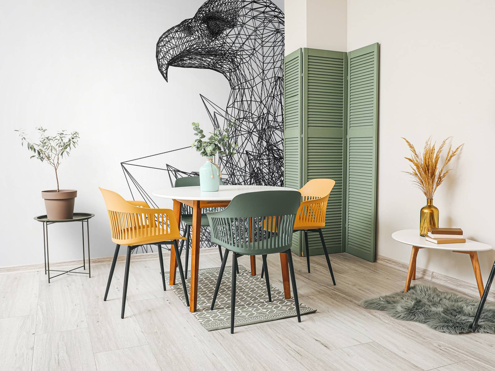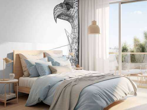 Wallpaper with an abstract triangular hawk, formed by several black lines