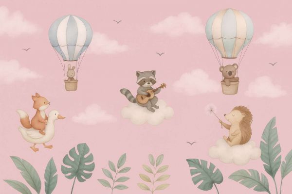 In this tender design, forest animals float through a soft pink sky full of clouds and pastel green leaves. A raccoon plays guitar on a little cloud, while a hedgehog holds a fluffy dandelion. Meanwhile, a rabbit and a bear sail in hot air balloons with subtle blue tones. At the bottom, we see a fox happily riding on the back of a friendly goose, surrounded by graceful leaves in gray-green and mint. The color palette consists of soft pastel colors: light pink, powder blue, cream, terracotta, and gray-green. The illustration style is delicate and friendly, with round shapes and soft textures that exude tranquility. Thanks to the pink sky with subtle clouds, the overall feel is airy and loving, perfect as a decor for a baby's room. This design fits nicely with interiors of a romantic, Scandinavian, or fairytale style. Combine it with furniture in white or light wood, textiles in pastel pink, soft blue, or sand tones, and accessories such as cloud lamps, hanging plants, or felt animals on the wall. A mobile or wall hanging with balloons or leaves complements this perfectly. Appropriate for baby rooms, play corners, or quiet reading nooks. This image creates a cozy atmosphere and invites imagination and calm dreams. The design grows with the child, thanks to its timeless appearance and subtle use of color.