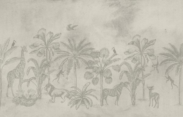 A real animal jungle in green. The animal jungle consists of lions, giraffes, monkeys, deer and more. Hip and trendy wallpaper.