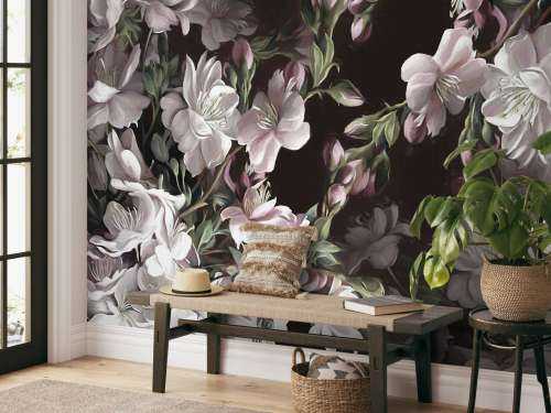 This beautiful design captures the beauty of cherry blossoms in full bloom, with a refined balance between soft pastel shades and a deep, dark background. The white and light pink flowers, framed by subtle green, have an almost three-dimensional appearance, as if they are glowing out of the darkness. The classic painterly details give this design a timeless and romantic look, perfect for those who love elegance with a touch of drama. In a modern and luxurious interior, this design shines beautifully, especially in combination with black or dark woods, gold accents, and rich fabrics like velvet. It creates an impressive contrast and gives a space a mysterious yet stylish appearance. In a classic or baroque setting, this floral motif can create a lush and refined atmosphere, perfectly complementing ornate furniture and crystal lighting. Thanks to the dark background and light blossoms, this design has a unique depth effect, making it ideal for a chic living room, an elegant bedroom, or even a stylish entrance hall. In a boutique hotel or a luxury restaurant, it could create an exclusive and artistic ambiance. The combination of romantic cherry blossoms and a powerful background makes this design both dreamy and bold. It brings a touch of refined nature indoors while adding an artistic and luxurious element to any space.