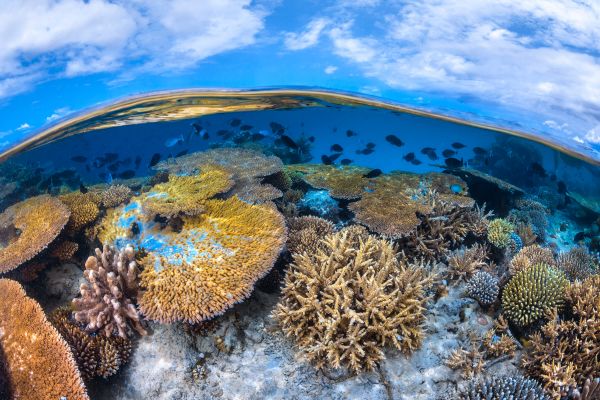 A photo of a coral reef, where you can look above the water and below the water. This gives the photo a round effect.