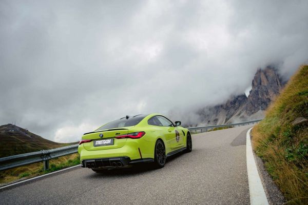 A bright green sports coupe climbs up a winding mountain road, surrounded by threatening clouds and rugged mountain peaks. The mist conceals the summits, while the car forms a striking contrast with the dramatic landscape. The perfect mix of speed, adventure, and nature.