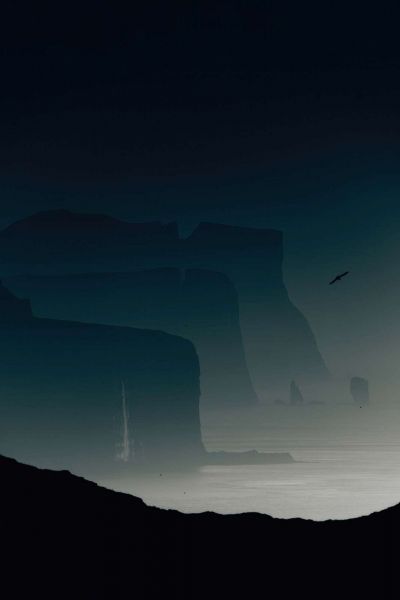 This image breathes mystery and tranquility. Multiple massive cliffs are outlined in a layered perspective, each subtly blurred by a thick haze of blue-gray mist. The color tones are deep, subdued, and almost monochromatic: variations of midnight blue, steel gray, and cool sea green dominate the composition. In the distance, a bird glides through the air, a small but powerful element that brings movement to this otherwise frozen world.
