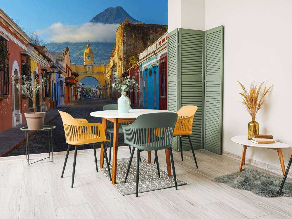 Beautiful Guatemalan street with colored houses and a volcano in the background.