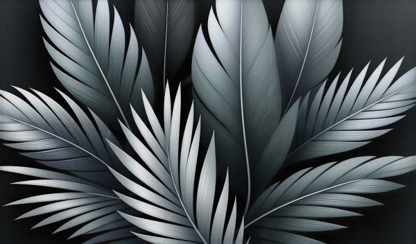 This image consists of carefully layered feathers that together form a balanced and calm composition. The feathers are rendered with fine veins and flowing lines, creating a subtle texture that looks both refined and natural. The color palette is dominated by cool gray tones, ranging from almost silvery light gray to deep blue-gray, giving the whole a calm and restrained appearance. The dark background provides a strong contrast and makes the light feathers stand out visually. This makes the design particularly suitable for modern and minimalist interiors, where it can serve as a soft yet pronounced visual element. In combination with sleek furniture, matte surfaces and materials such as steel, glass or concrete, a stylish and contemporary whole emerges. Also within a Scandinavian interior style, this design sits nicely. The cool colors pair perfectly with light woods, neutral fabrics and a subdued color palette. Think of combinations with a light gray sofa, wooden side tables and accessories in white, wool or ceramics. The feathers add an organic touch here without disturbing the calm. This design is widely applicable and fits well in rooms such as a living room, bedroom or office. In a bedroom it contributes to a serene and relaxed atmosphere, ideal for a quiet environment. In a work space or office it provides a stylish, focused appearance without overpowering. The combination of cool colors, soft shapes and refined details makes this image timeless and versatile for deployment within a variety of interior concepts.