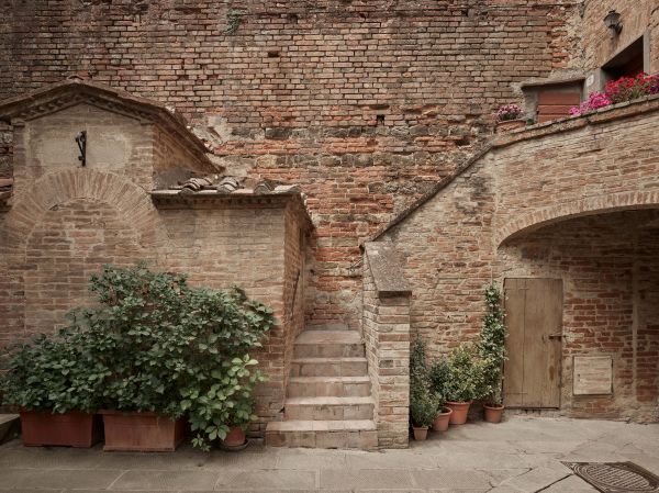 Courtyard with beautiful flowers in Italy. Combine this photo wallpaper in the living room, for example.