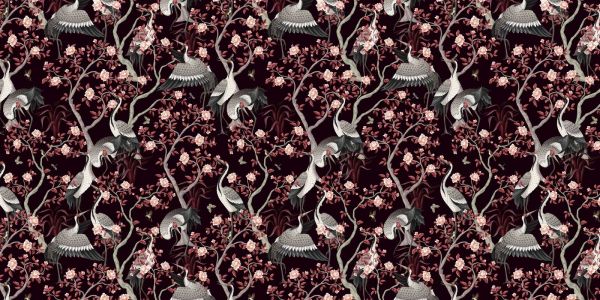 Against a rich, dark background unfolds an elegant dance of cranes amidst blooming blossoms. The graceful posture of the birds and the delicate pink of the flowers form a classic and timeless pattern that exudes both tranquility and movement.