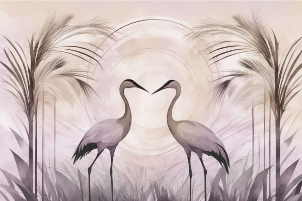 Twee elegante kraanvogels staan harmonieus tegenover elkaar, omringd door sierlijke palmbomen en een subtiel gelaagde achtergrond. De zachte beige en grijsbruine tinten stralen sereniteit en rust uit. De delicate aquarelstijl en symmetrische compositie geven het geheel een dromerige, bijna meditatieve uitstraling.
