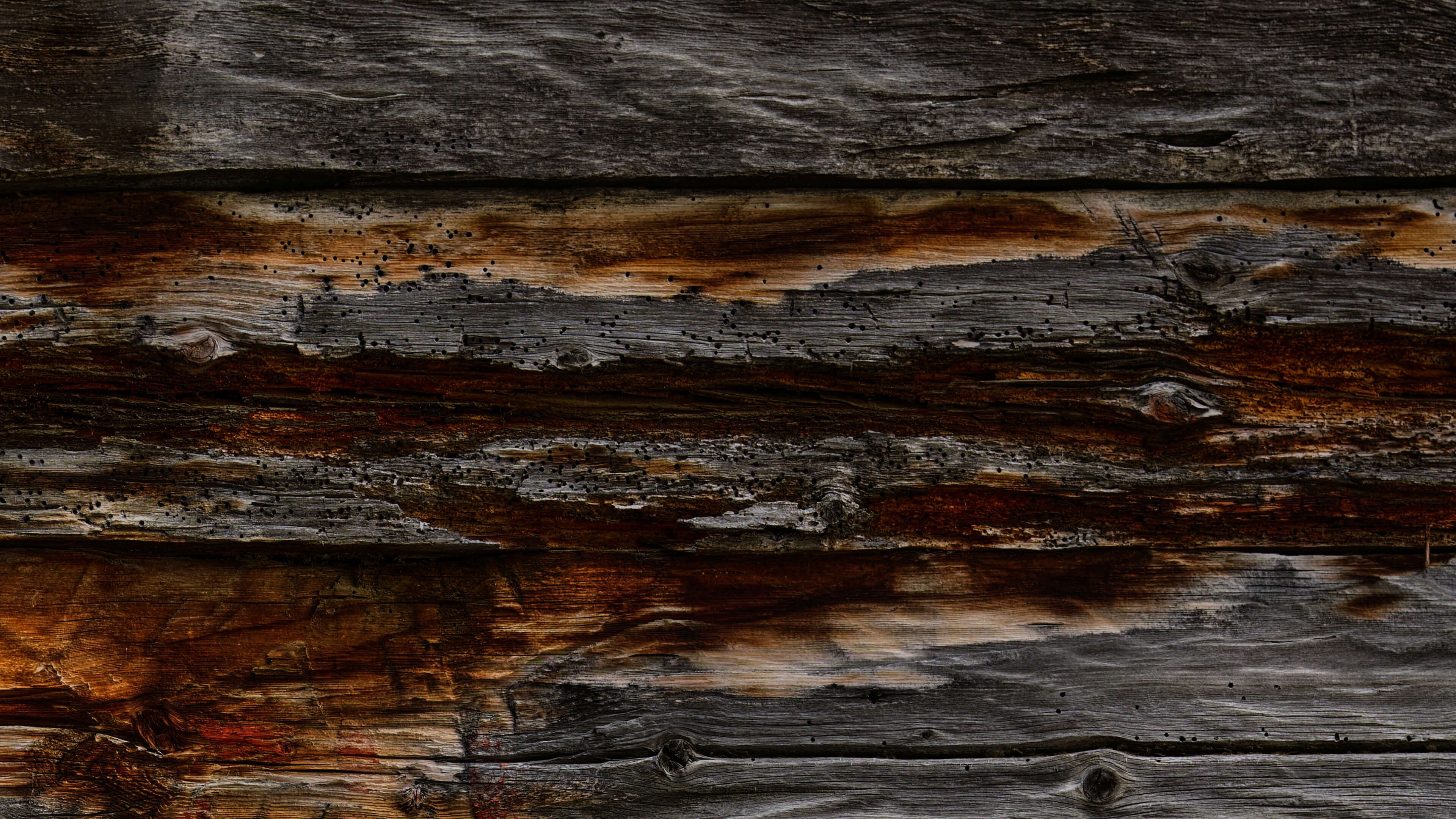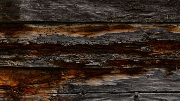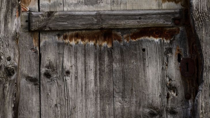 Dark wood with a door and broken off wood. The broken off wood gives this photo wallpaper a nice realistic effect.