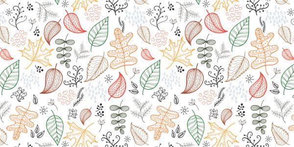 Wallpaper with a print of drawn autumn leaves in brown, orange and green tones