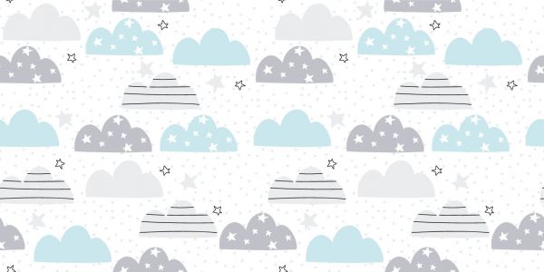 Photo wallpaper with blue and grey drew clouds with different illustrations on a white background with grey dots.