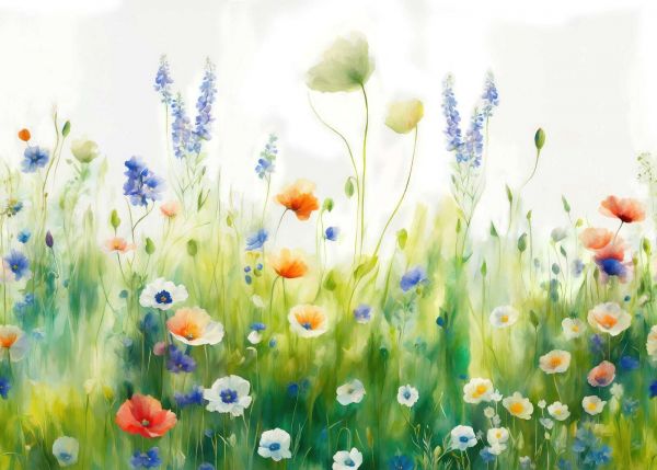 The beauty of a wildflower meadow comes to life in this refined watercolor design. The soft brushstrokes create an almost dreamy effect, featuring delicate flowers such as poppies, cornflowers, and daisies in full bloom. The shades range from fresh green and warm orange to subtle blue and bright white, providing a playful yet calming contrast. The light background makes the whole piece airy and timeless. This design fits perfectly within a romantic or rustic interior style, bringing a sense of harmony and natural beauty. In a Scandinavian interior, it can enhance the fresh and minimalist look, while in a bohemian setting, it adds a playful and artistic touch. Combine this floral composition with light wooden furniture, linen curtains, and soft pastel tones to maintain the soothing atmosphere. For a more pronounced look, accessories in earth tones and natural materials such as rattan and ceramics can be added. This design is ideal for bedrooms, living rooms, or a light conservatory, where it creates a sense of openness and serenity. The soft watercolor style and harmonious color use ensure that this flower meadow effortlessly gives a timeless and elegant appearance to any space.