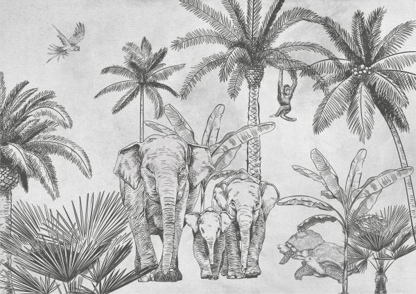 Elephants and turtles in the forest. Hip and trendy wallpaper. This wallpaper will really finish your room.
