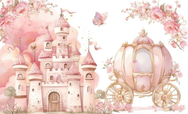 A romantic scene with an enchanting pink castle, an elegant carriage, and lush flowers. The soft watercolor-like shades of pink, gold, and cream create a fairy-tale atmosphere full of magic and dreamy elegance. Butterflies and stars add an extra touch of fantasy.