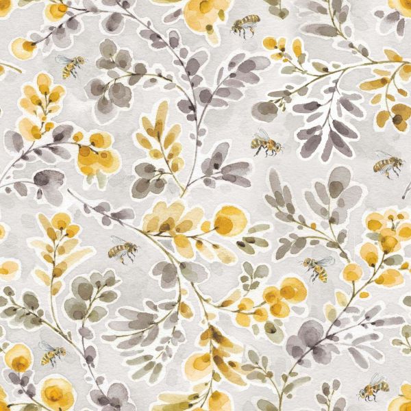 A soft watercolor pattern with dancing bees among yellow blossom branches and gray-green leaves. The colors are harmonious and soothing, with warm ocher yellow tones and subtle gray shades.