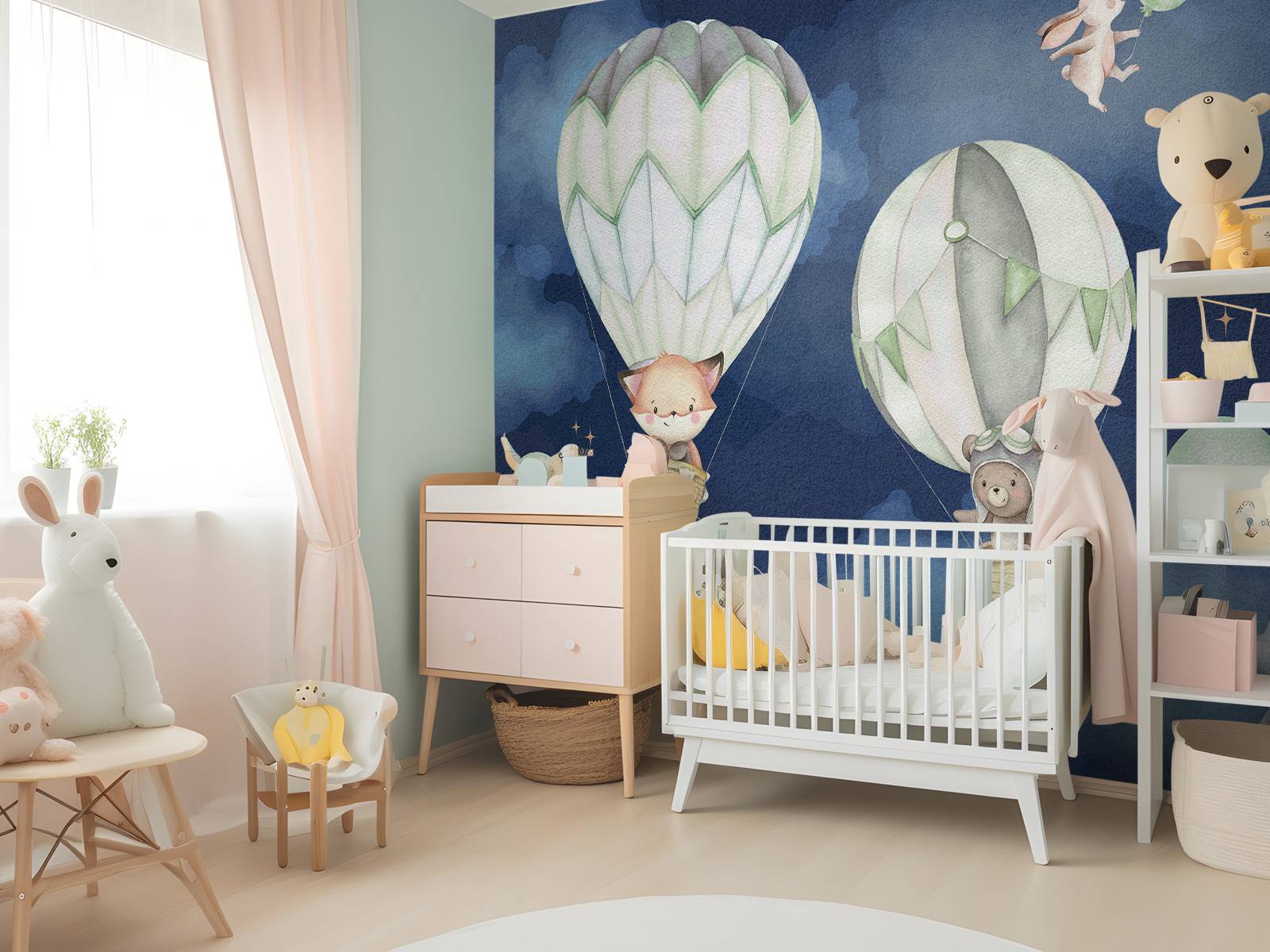 Cute animals flying and floating in the sky with green balloons.