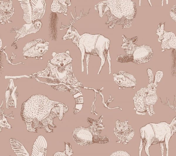 This design captures the essence of a vibrant forest full of charming animals in a unique, hand-drawn style. From curious raccoons and graceful deer to cute hedgehogs and elegant owls, each animal is illustrated with care and precision. The pattern is composed of soft sepia and brown tones, creating a warm and timeless appearance. The subtle lines and nostalgic drawing style give a playful yet refined character that appeals to both children and adults. This print is particularly versatile and can be beautifully integrated into various interior styles. In a rustic or country setting, it can be combined with natural materials like wood and linen for a harmonious look. For a more modern atmosphere, it works well in combination with minimalist furniture and accessories in neutral tones, with the pattern providing a subtle playful accent. Ideal for use in children's rooms, play areas, or as an accent wall in a living room, this design brings a piece of nature indoors. It reminds us of the simplicity and beauty of the outdoors while creating a warm and inviting atmosphere. Perfect for anyone with a love for nature and the animal world, this design evokes a sense of connection with nature and invites dreams of adventures in the forest.