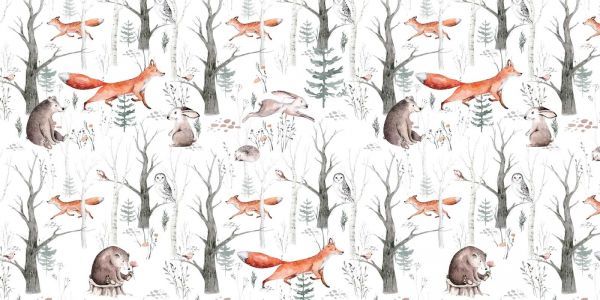 Soft brushstrokes bring an enchanting forest to life, where foxes, rabbits, and owls hide among the trees. This watercolor pattern exudes the serenity of nature, with each animal serenely placed in a wintry, tranquil forest setting, as if listening to the quiet whispers of nature.