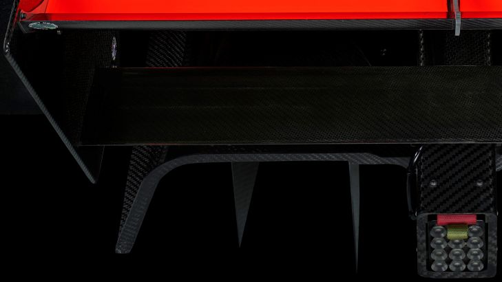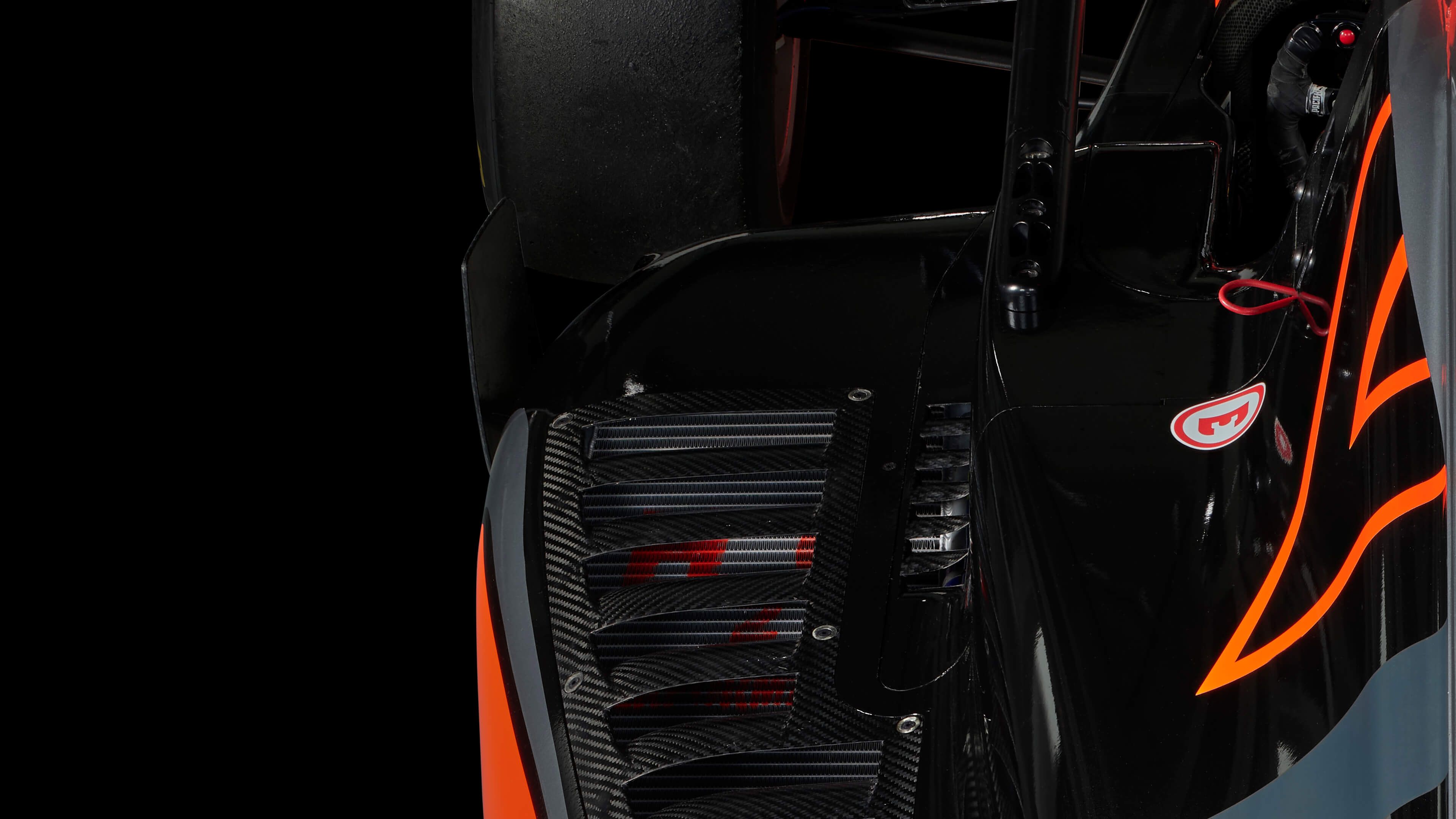 Rear of a Formula 3 racing car in unique high quality with sharp details such as the exhaust and ventilation grilles. Printed with a black background.