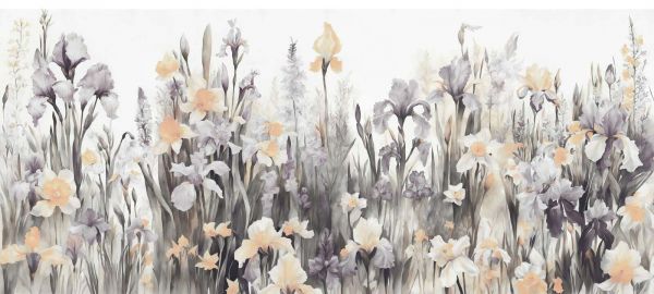 A soft flower meadow full of irises and daffodils in creamy beige watercolor tones. The subtle, natural colors create a cozy and inviting atmosphere that shines everywhere.