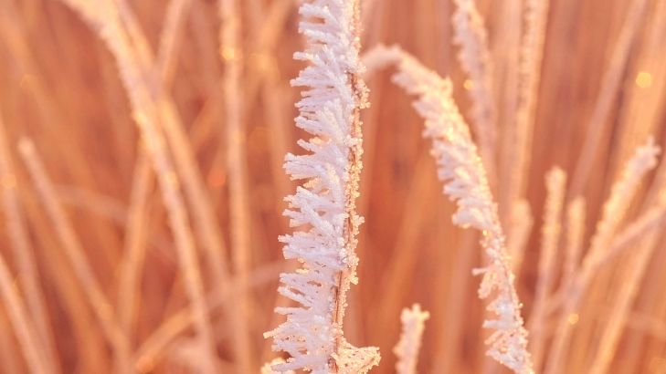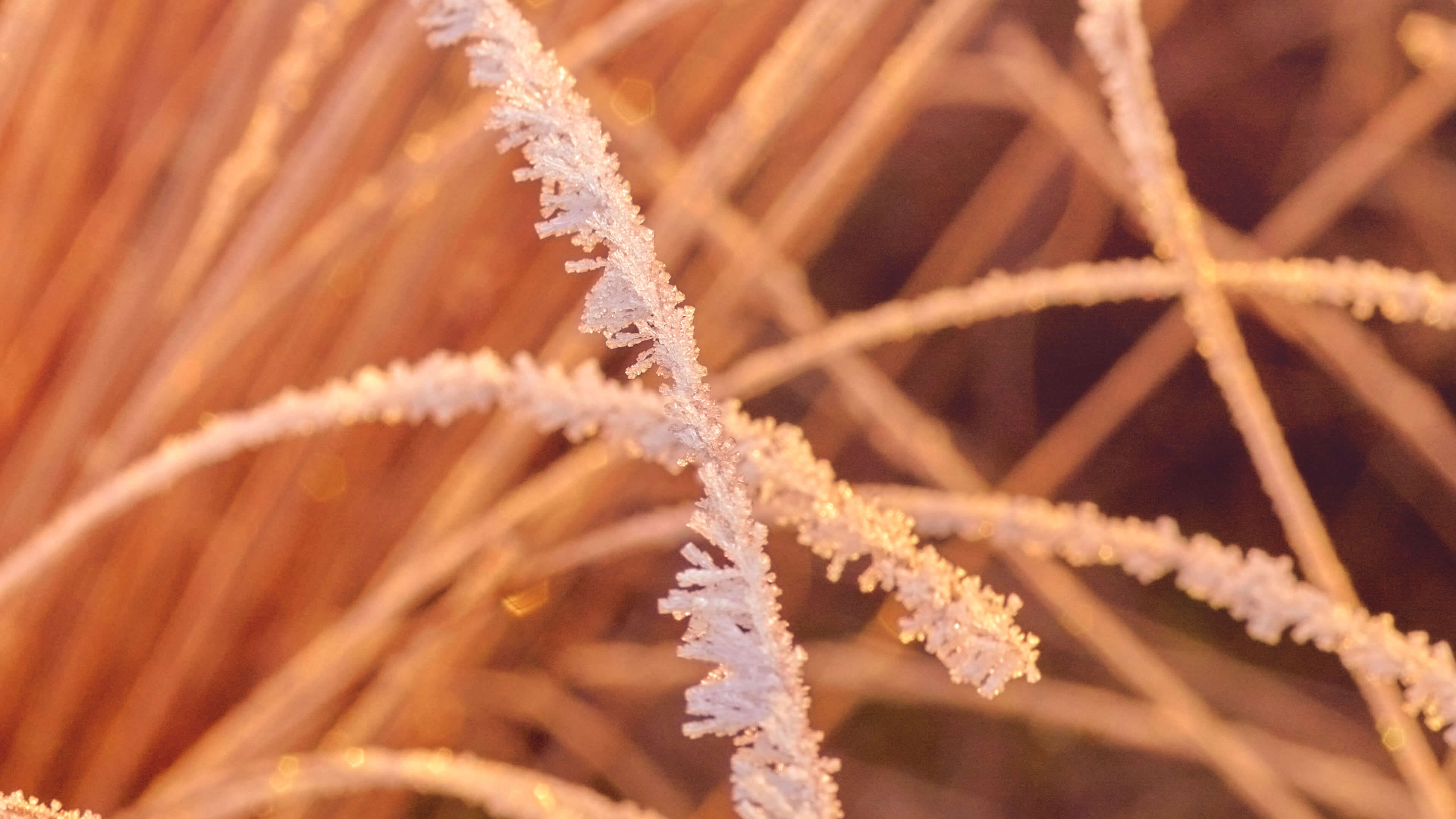 Frozen grasses during a sunrise. Because of the sharp photo, you can clearly see that the grass is frozen.