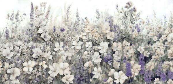 This design captures the magic of a soft flower meadow in a dreamy and serene style. The delicate white and lilac flowers, ranging from tender blossoms to exuberant flower spikes, create a harmonious scene that evokes a sense of calm and refinement. The subtle watercolor tones provide a soft and elegant appearance, allowing the design to effortlessly fit into various interior styles. In a romantic or rustic interior, this design enhances the natural and idyllic atmosphere. Think of light wood furniture, soft linen fabrics, and accessories in pastel and earth tones. The flowers add a poetic touch to the space, making it warm and inviting. For a more modern or minimalist setting, this design offers a perfect contrast. The neutral tones and soft shapes can be beautifully combined with sleek white or gray furniture and subtle gold accents. The muted lilac shades add a touch of color without disturbing the tranquility of the space. This design is ideal for areas where a calming and elegant atmosphere is desired, such as bedrooms, living rooms, or even a luxury bathroom. The flowers bring a touch of nature indoors and create a timeless look that never gets boring. With its soft and refined color palette, this design brings a subtle yet powerful charm to any space.