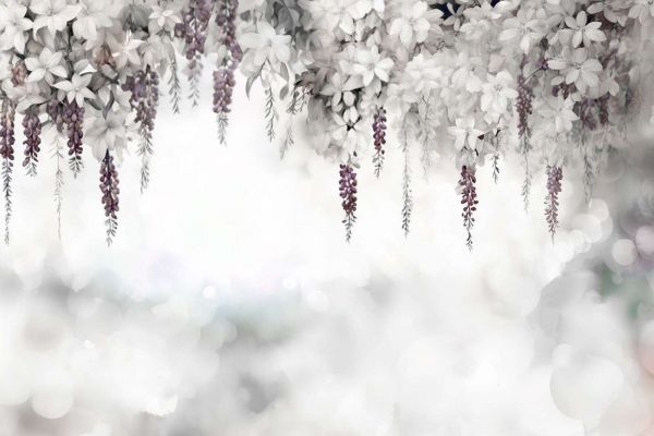Dit betoverende ontwerp brengt de zachte elegantie van een bloeiende pergola tot leven. De sierlijke witte jasmijnbloemen en hangende wisteria in warme sepia- en paarstinten zorgen voor een verfijnde en romantische uitstraling. De aquarelachtige achtergrond met zachte lichtreflecties en mistige accenten versterkt de dromerige sfeer en geeft het geheel een luchtig en tijdloos karakter.
