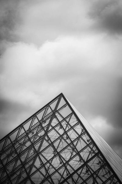 A sharp glass pyramid point stands out against a dramatic cloudy sky. The interplay of lines and reflections emphasizes modern minimalism and architectural strength.