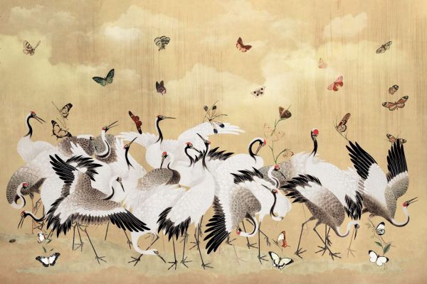 An elegant design featuring graceful cranes and delicate butterflies against a warm golden background. The design exudes harmony, movement, and refinement, perfect for a space with a serene and luxurious atmosphere.